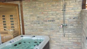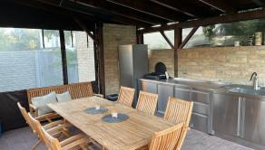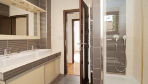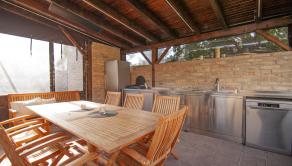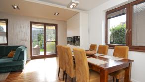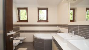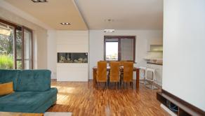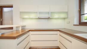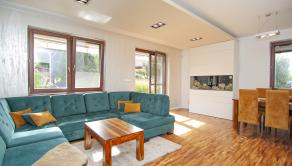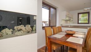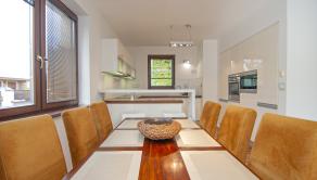 Kuchyňa - kuchynská linka nadštandardná na mieru v tvare U, drez kuchynský plastový s odkladacím priestorom, zabudovaný odpadkový kôš, sklokeramická varná doska zabudovaná, elektrická rúra zabudovaná, digestor, umývačka riadu zabudovaná, mikrovlnná rúra zabudovaná, chladnička a mraznička zabudovaná, súčasťou kuchynskej linky je barový pult obývacia izba - sadrokartónový podhľad so zabudovanými svietidlami. Kúpeľňa s WC - 2 umývadla keramické zabudované v nábytkovej skrinke, WC so zabudovanou nádržkou, bidet, vaňa plastová rohová obložená keramickým obkladom, sprchový kút (batérie podomietkové, plus sprchová hlavica), keramický obklad stien, rebríkový radiátor, zrkadlo zabudované, sadrokartónový podhľad so zabudovanými bodovými svietidlami zádverie. Plynový kotol Buderus a zásobník TÚV. Kúrenie v dome je podlahové teplovodné.